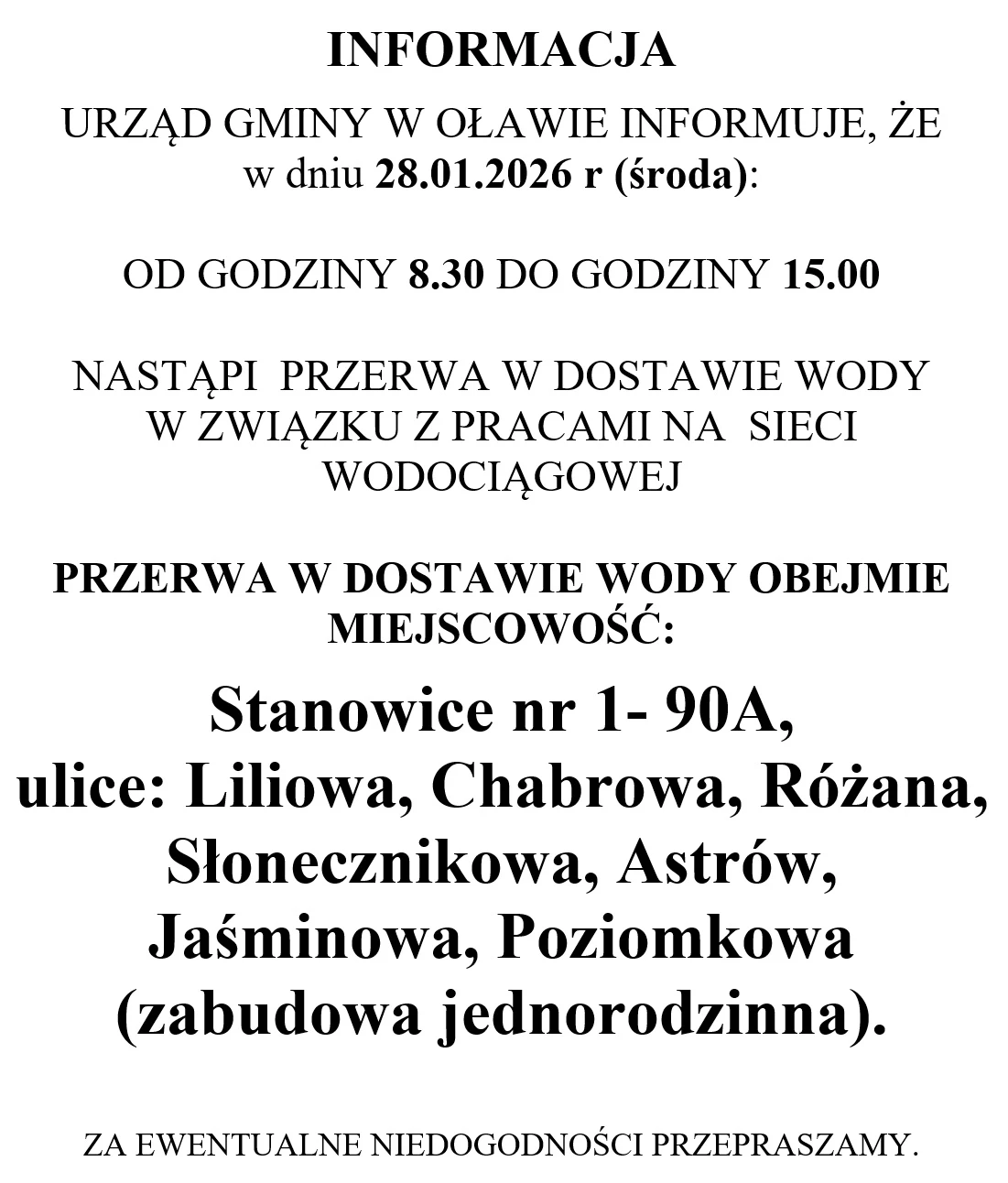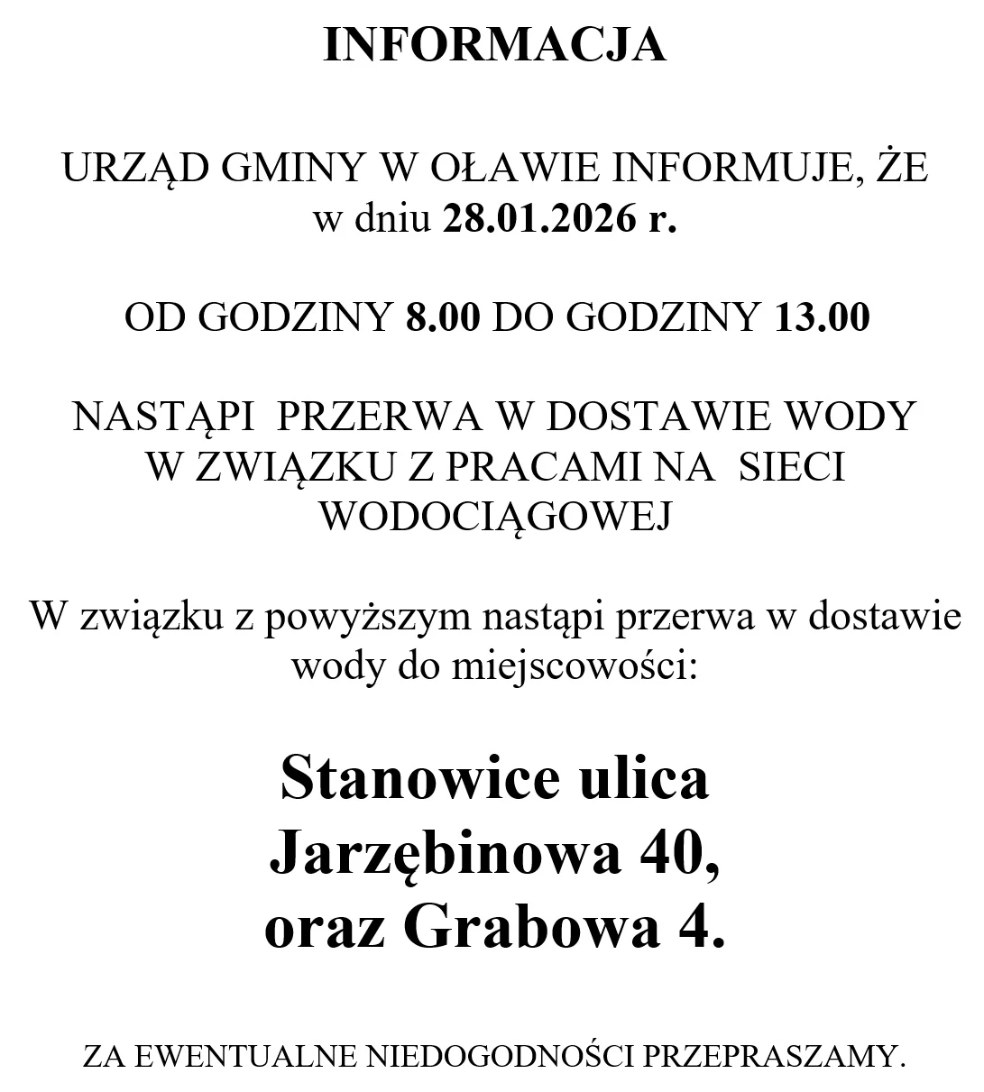 Gmina Oława informuje o planowanych przerwach w dostawie wody w Stanowicach.