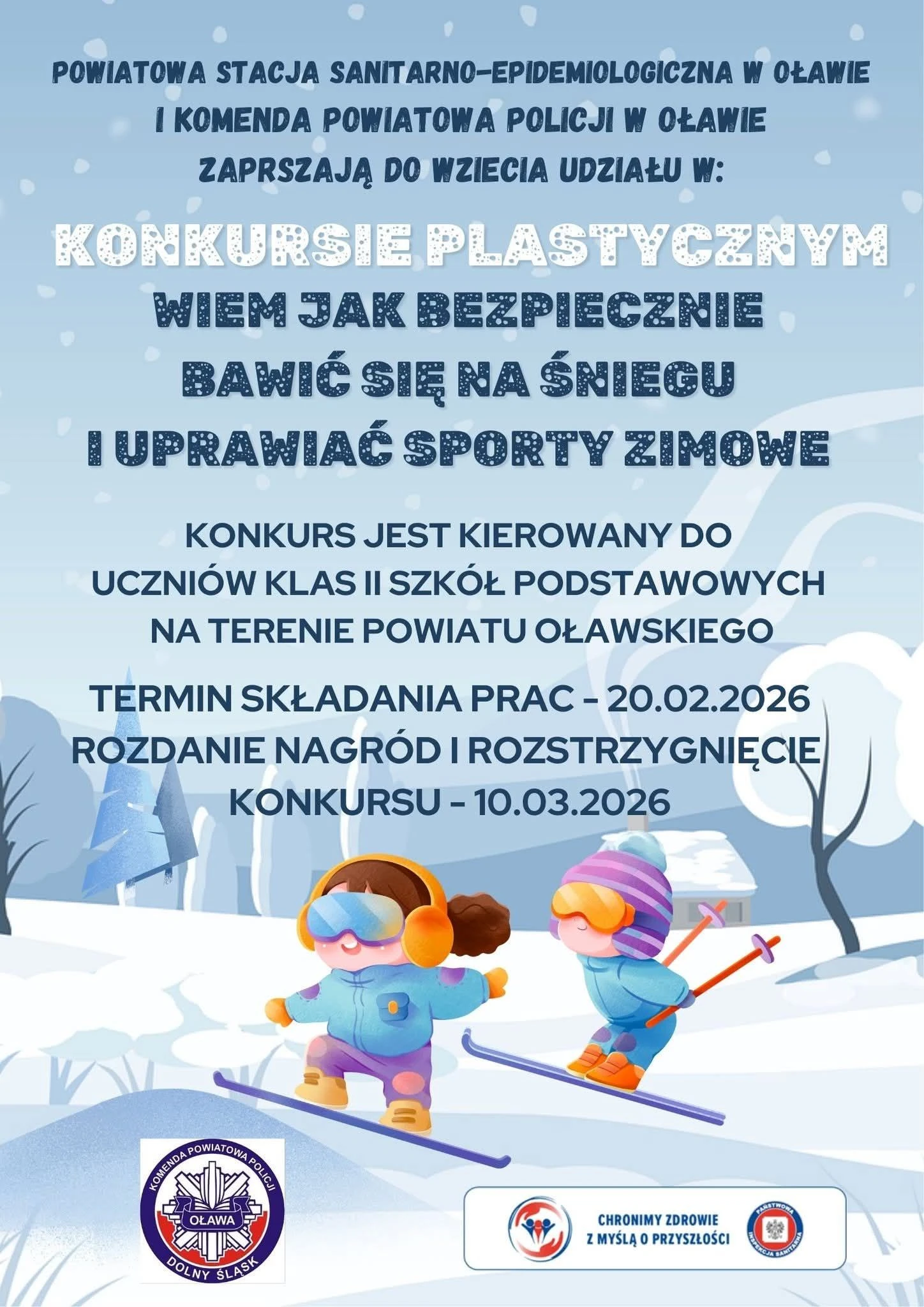 Oławska policja wraz z Powiatową Stacją Sanitarno-Epidemiologiczną zapraszają dzieci do udziału w konkursie plastycznym, którego celem jest promocja bezpiecznych i zdrowych zachowań podczas zimowego wypoczynku.