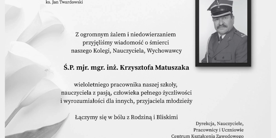 Społeczność szkolna Centrum Kształcenia Zawodowego i Ustawicznego w Oławie pogrążona jest w żałobie. Zmarł śp. mjr mgr inż. Krzysztof Matuszak, wieloletni nauczyciel, wychowawca i ceniony pracownik placówki.