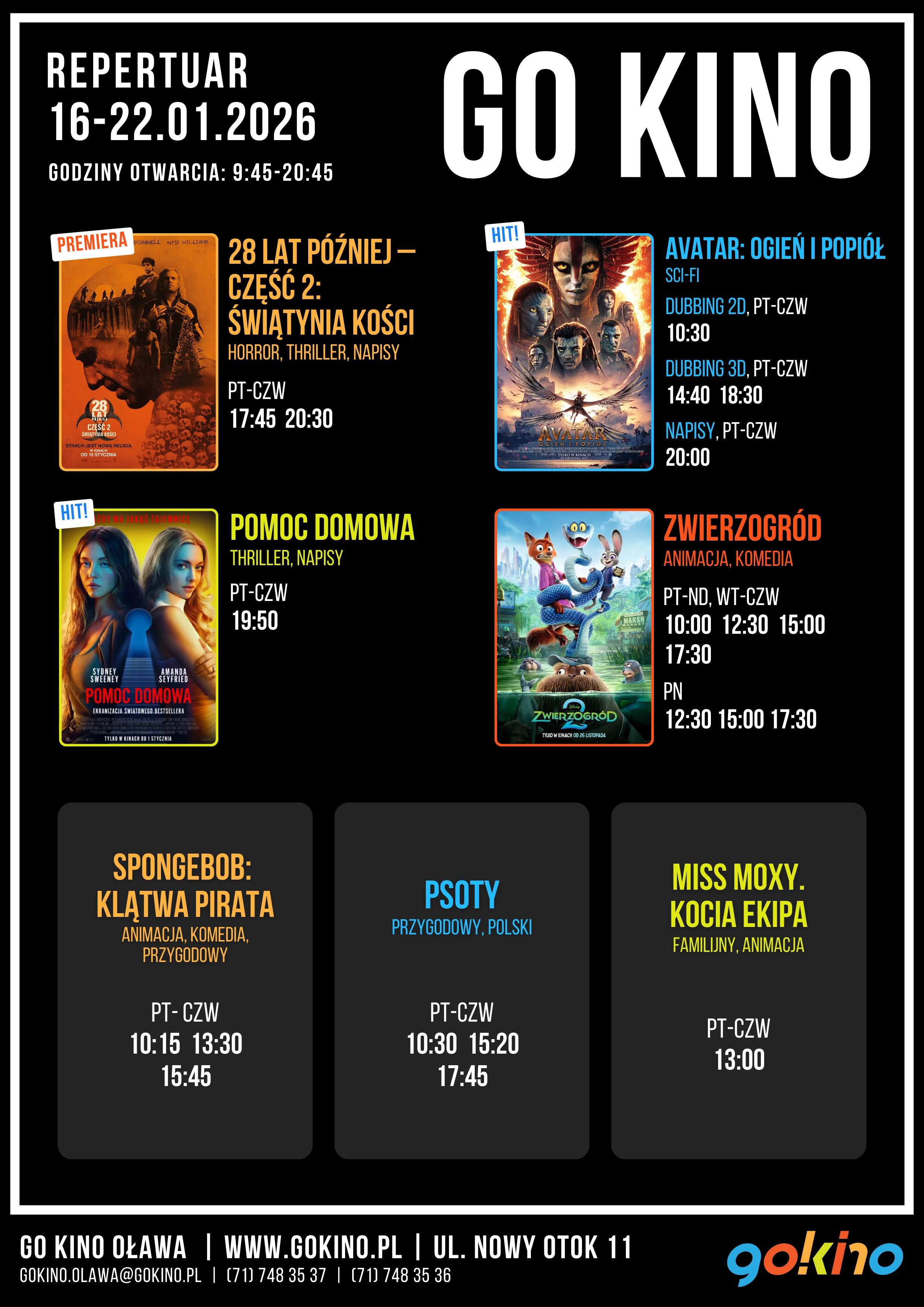 W najnowszym repertuarze GoKino premierowo horror "28 lat później - Część 2: Świątynia kości". Kinowy hit amerykańskiej produkcji "Avatar: Ogień i popiół" oraz thriller "Pomoc domowa".