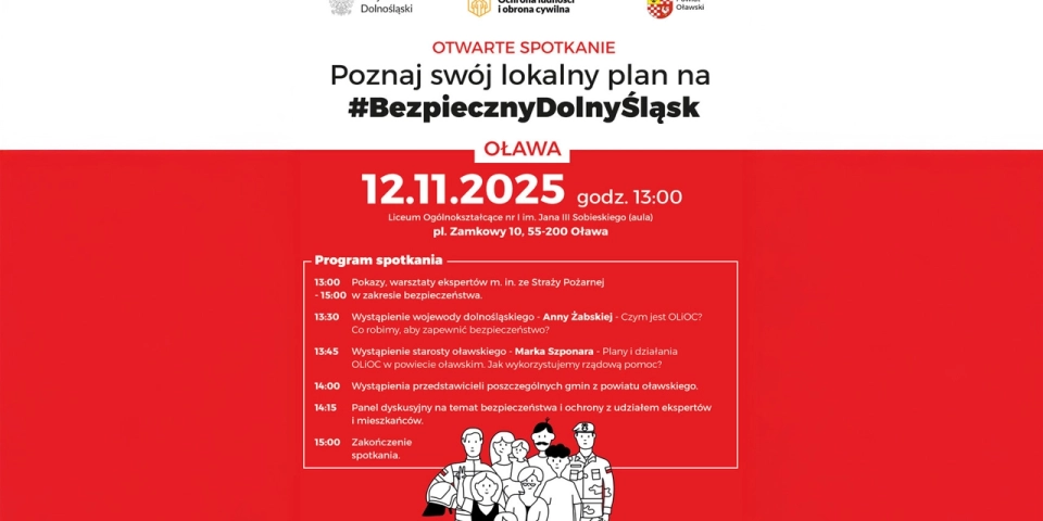 W wydarzeniu wezmą udział Wojewoda Dolnośląska Anna Żabska oraz Starosta Oławski Marek Szponar, którzy zapraszają wszystkich mieszkańców do wspólnej rozmowy o bezpieczeństwie.