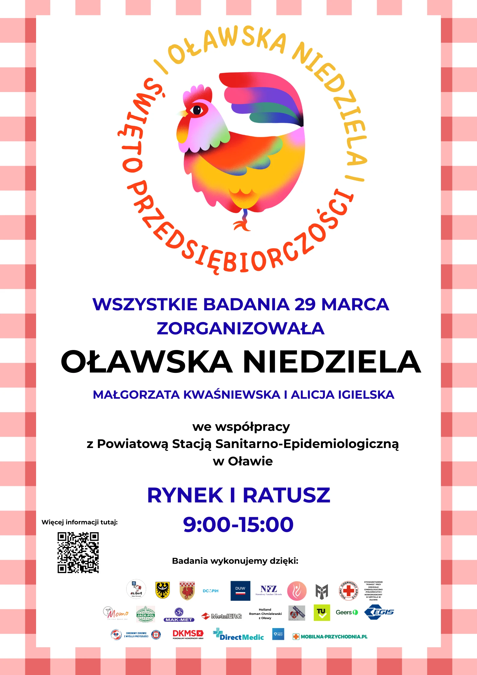W niedzielę, 29 marca podczas Oławskiego Jarmarku Wielkanocnego mieszkańcy będą mogli skorzystać z szeregu badań profilaktycznych. Wydarzenie jest częścią społecznych inicjatyw Oławskiej Niedzieli Święta Przedsiębiorczośći i ma na celu promowanie świadomości zdrowotnej oraz ułatwienie dostępu do podstawowych badań i konsultacji w jednym miejscu.