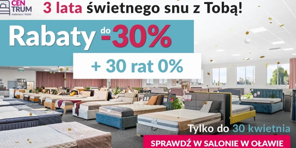 Z okazji trzeciej rocznicy działalności salon przygotował specjalną akcję promocyjną. Klienci mogą skorzystać z rabatów do -30% na wybrane produkty lub wybrać jedną z dodatkowych form promocji: 30 rat 0% (RRSO 0%), 120 zł zwrotu za każde wydane 1200 zł, dostawa i montażu za symboliczne 12 groszy. Promocje na materace obowiązują do 30 kwietnia.