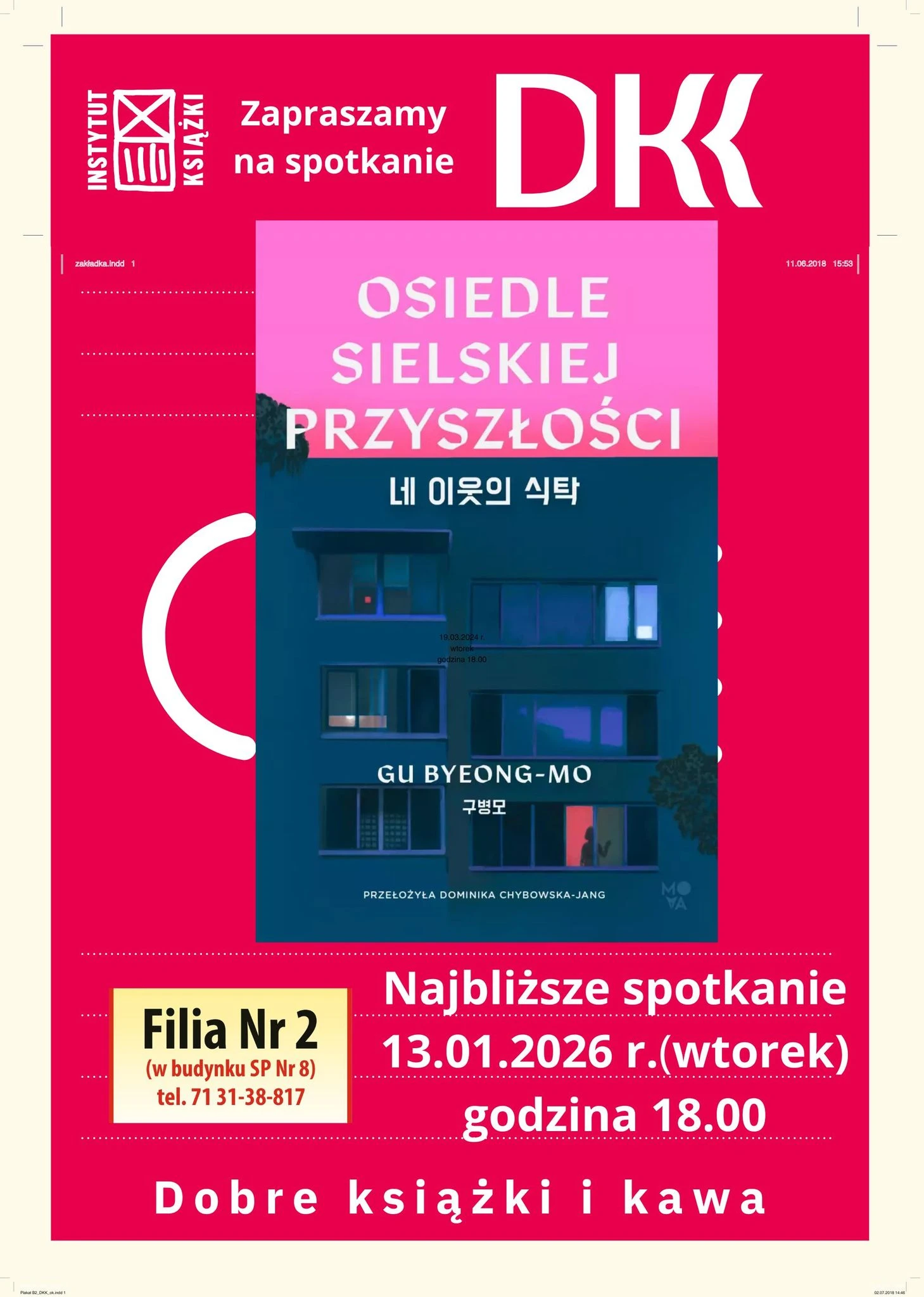 Uczestnicy spotkania porozmawiają o powieści "Osiedle Sielskiej Przyszłości" autorstwa Byeong-mo Gu - poruszającej historii o macierzyństwie, małżeństwie i kobiecej tożsamości, ukazującej presję społecznych oczekiwań.