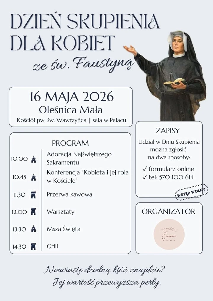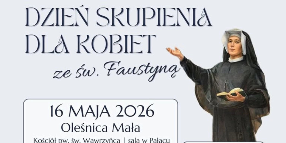 16 maja w kościele w Oleśnicy Małej odbędzie się Dzień Skupienia dla Kobiet. W programie Adoracja Najświętszego Sakramentu, konferencja pod tytułem "Kobieta i jej rola w Kościele", warsztaty oraz Msza Święta. O godzinie 14:30 zaplanowano grilla. Wstęp na wydarzenie jest wolny, ale obowiązują zapisy.