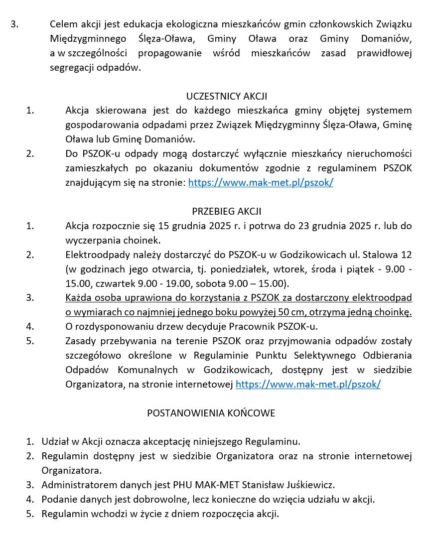 Za dostarczenie zużytego sprzętu elektrycznego lub elektronicznego w dniach od 15 do 23 grudnia każdy mieszkaniec dostanie choinkę. Elektroodpady należy dostarczyć do PSZOK-u w Godzikowicach ul. Stalowa 12 (pon-śr, piątek, godz. 9:00-15:00, czwartek 9:00-19:00, sobota 9:00-15:00).