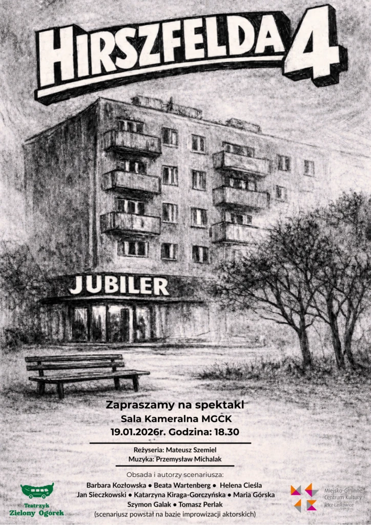 19 stycznia o godzinie 18:30 w sali kameralnej MGCK odbędzie się spektakl warsztatowy "Hirszfelda 4” zbudowany z improwizacji. Występ jest efektem wspólnej pracy nowej grupy teatralnej działającej przy Centrum Kultury w Jelczu-Laskowicach.
