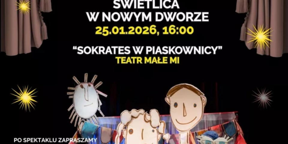 -„Sokrates w piaskownicy” – uwielbiany, pełen humoru, muzyki i mądrości spektakl Teatru Małe Mi! W piaskownicy spotkają się niezwykłe lalkowe postacie - Sophia i Philo, które z dziecięcą ciekawością pytają o to, co najważniejsze: miłość, złość, odwagę, strach…i o to, jak lepiej poznać siebie samych. To przedstawienie to nie tylko zabawa – to zaproszenie do wspólnego, rodzinnego filozofowania i odkrywania świata razem z dziećmi. Scenariusz powstał na podstawie rozmów Sławy Tarkowskiej z dziećmi z całej Polski - więc na scenie zobaczycie prawdziwe dziecięce pytania, emocje i spojrzenia na świat. A my… bardzo lubimy, gdy dzieci poszerzają horyzonty, poznają inspirujące postacie i odkrywają swój wewnętrzny świat- informuje MGCK w Jelczu-Laskowicach.