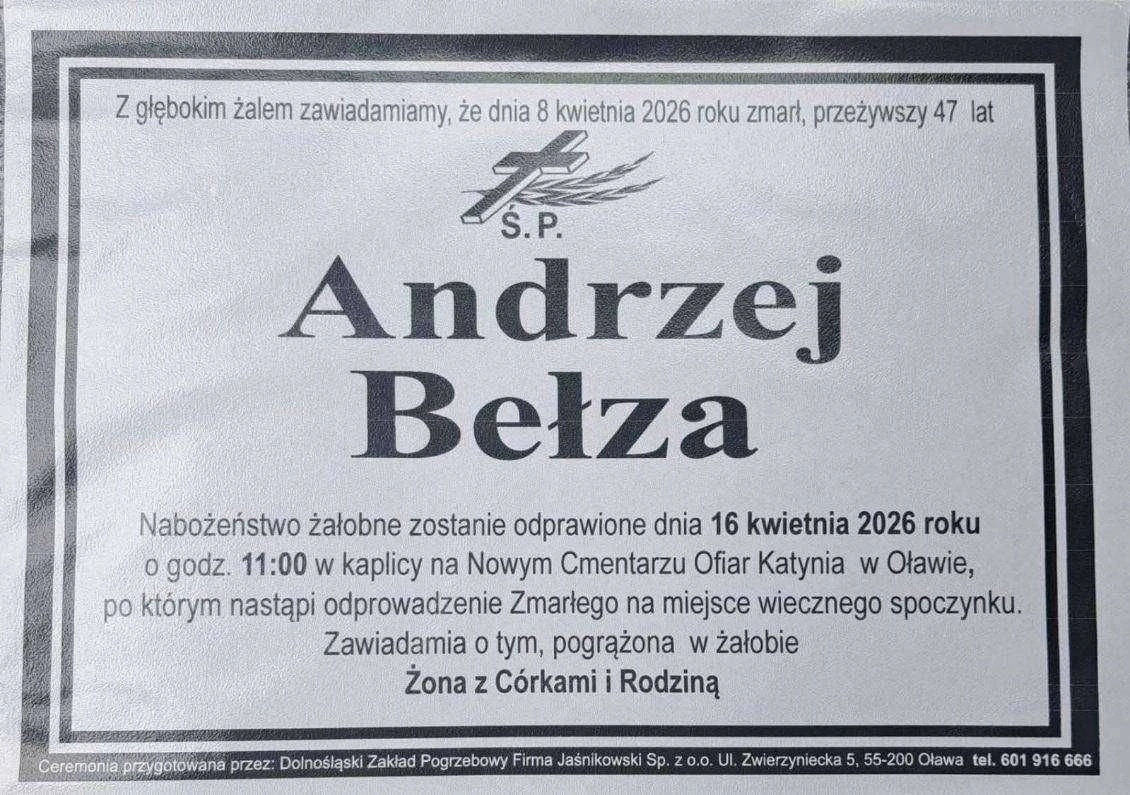 Portal kibiców drużyny piłki nożnej Moto-Jelcz Oława poinformował o nagłej śmierci kolegi z trybun. Z głębokim smutkiem zawiadamiamy, że 8 kwietnia 2026 roku, zmarł przeżywszy 47 lat, Śp. Andrzej Bełza.
