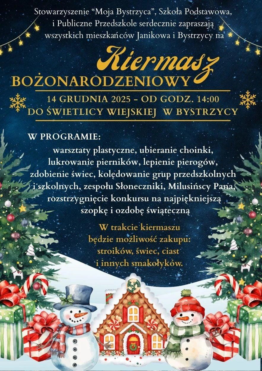 Stowarzyszenie "Moja Bystrzyca", Szkoła Podstawowa oraz Publiczne Przedszkole serdecznie zapraszają wszystkich mieszkańców Janikowa i Bystrzycy na wyjątkowy Kiermasz Bożonarodzeniowy, który odbędzie się 14 grudnia od godziny 14:00 w świetlicy wiejskiej w Bystrzycy.