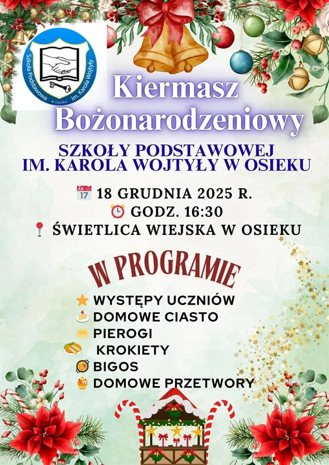 Szkoła Podstawowa w Osieku serdecznie zaprasza na kiermasz świąteczny. Wydarzenie odbędzie się 18 grudnia o godzinie 16:30 w świetlicy wiejskiej w Osieku. Na odwiedzających czeka moc atrakcji, m.in. występy uczniów, pyszne domowe wypieki, przetwory oraz wiele innych niespodzianek.