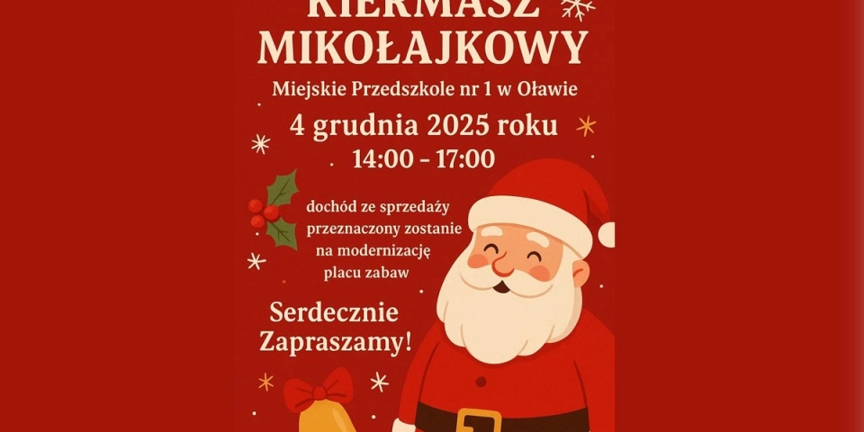 4 grudnia w godzinach od 14:00 do 17:00 w Miejskim Przedszkolu nr 1 w Oławie na ulicy Iwaszkiewicza 11 odbędzie się kiermasz świąteczny. Dochód ze sprzedaży zostanie przeznaczony na modernizację placu zabaw. - Będą przygotowane stoiska z pysznymi ciastami, świątecznymi pierniczkami, suszem owocowym, świeczkami, balonami, figurkami gipsowymi. Będzie można skorzystać z fotoramki. Stoiska będą rozstawione w korytarzu przy portierni. Serdecznie zapraszamy - informuje Miasto Oława.