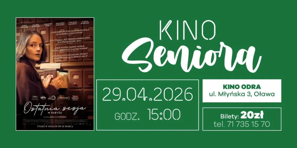 29 kwietnia o godzinie 15:00 w Kinie Odra będzie można zobaczyć kolejny film z cyklu Kino Seniora. Na ekranie wyświetlony zostanie dramat "Ostatnia Sesja w Paryżu". - Lilian (laureatka Oscara Jodie Foster) jest cenioną psychiatrą prowadzącą własną praktykę w Paryżu. Jej uporządkowany świat zaczyna się rozpadać po nagłej śmierci wieloletniej pacjentki. Czy było to samobójstwo, morderstwo, a może tragiczna pomyłka lekarska? Dręczona wątpliwościami i poczuciem winy Lilian rozpoczyna prywatne śledztwo, wciągając w nie byłego męża (Daniel Auteuil)- informuje Centrum Sztuki.