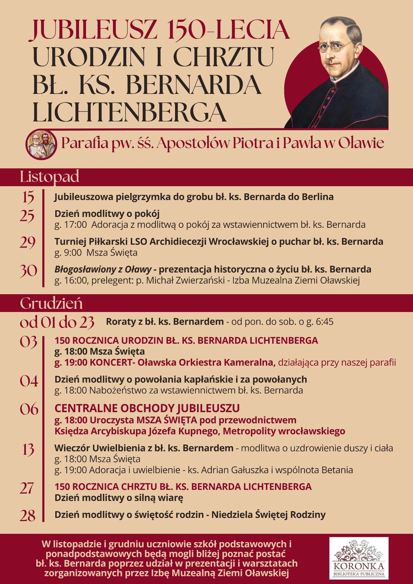 Z okazji rocznicy urodzin wybitnego oławianina parafia przygotowała szereg wydarzeń. Poniżej znajdziesz ich harmonogram.