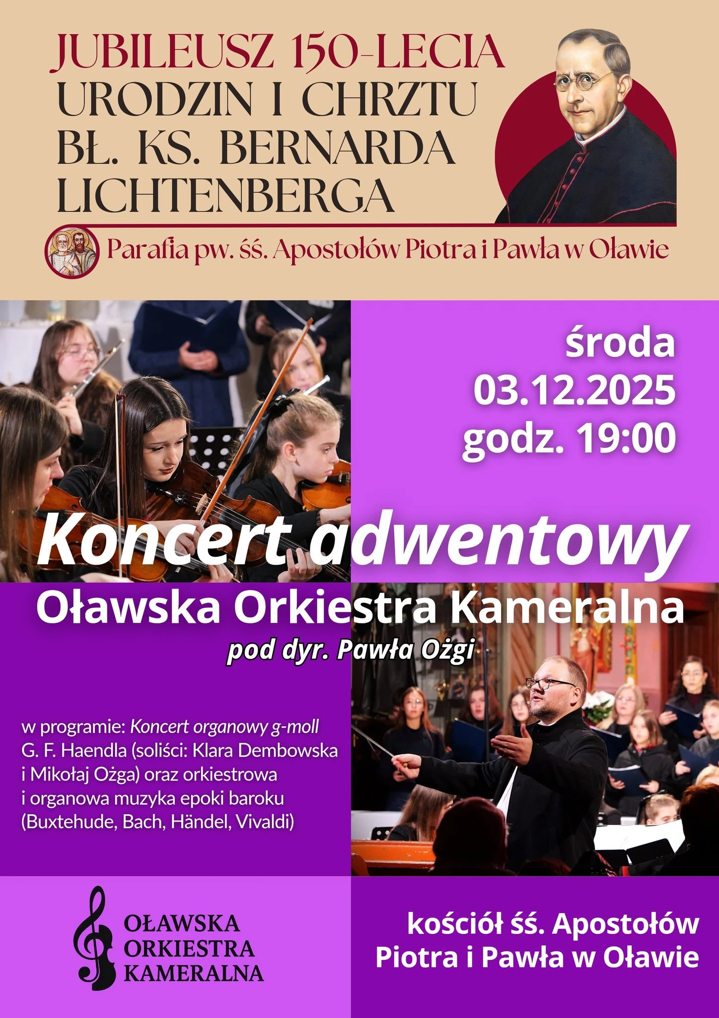 W kościele pod wezwaniem śś. Apostołów Piotra i Pawła, 3 grudnia odbędzie się Koncert Adwentowy z okazji urodzin bł. ks. Bernarda Lichtenberga. Uroczystość rozpocznie się Mszą świętą o godzinie 18:00, a po niej, o 19:00, wystąpi działająca przy parafii Oławskiej Orkiestra Kameralna pod dyrekcją Pawła Ożgi.