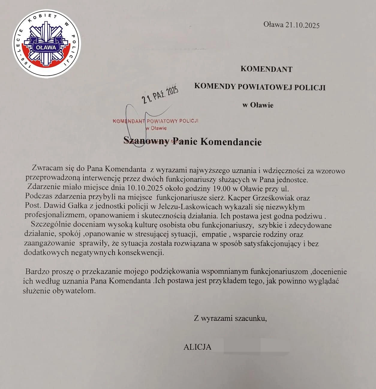Do Komendanta Powiatowego Policji w Oławie wpłynęły podziękowania oraz wyrazy głębokiej wdzięczności od mieszkanki Oławy, zaniepokojonej o los jednego z członków swojej rodziny. Kobieta przekazała słowa uznania dla funkcjonariuszy z Ogniwa Patrolowo-Interwencyjnego Komisariatu Policji w Jelczu- Laskowicach - sierż. Kacpra Grześkowiaka i post. Dawida Gałka. Doceniła ich profesjonalne podejście, empatię oraz wsparcie okazane podczas przeprowadzonej interwencji.