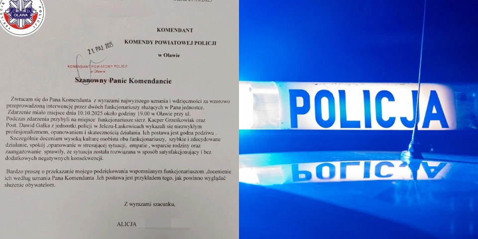- Zwracam się do Pana Komendanta z wyrazami najwyższego uznania i wdzięczności za wzorowo przeprowadzoną interwencję przez dwóch funkcjonariuszy służących w Pana jednostce. Podczas zdarzenia przybyli na miejsce policjanci wykazali się niezwykłym profesjonalizmem, opanowaniem i skutecznością działania. Ich postawa jest godna podziwu. Szczególnie doceniam wysoką kulturę osobistą, spokój, empatię oraz wsparcie rodziny, które sprawiły, że sytuacja została rozwiązana w sposób satysfakcjonujący i bez dodatkowych negatywnych konsekwencji. Ich postawa jest przykładem tego, jak powinno wyglądać służenie obywatelom.