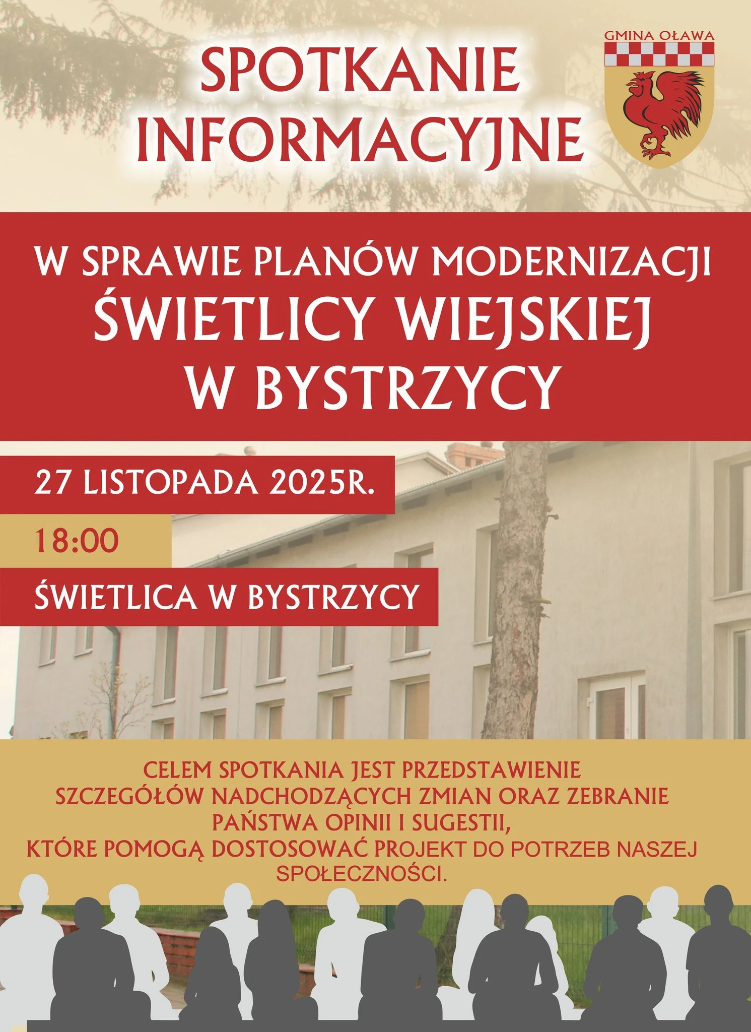 Gmina Oława organizuje spotkanie w sprawie planów przebudowy świetlicy w Bystrzycy.