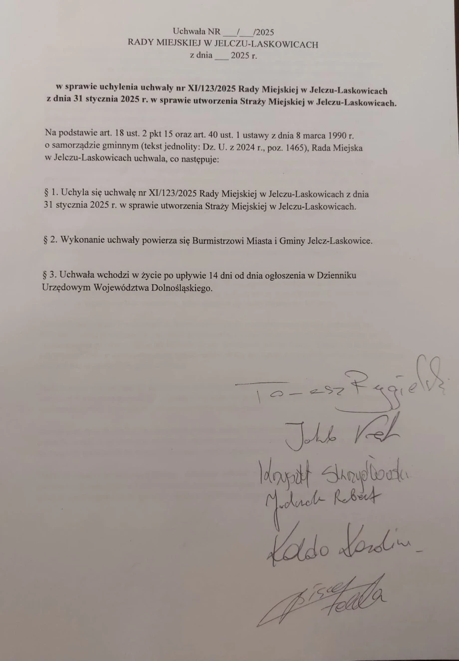 Radni każdego z klubów zasiadających w Radzie Miejskiej w Jelczu-Laskowicach podpisali się pod projektem uchwały w sprawie odwołania powstania straży miejskiej w mieście.