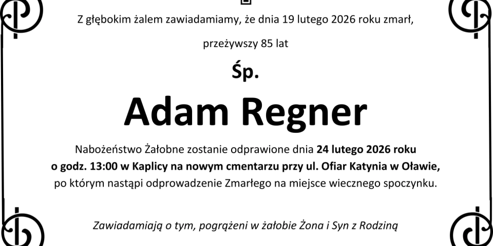 Z głębokim smutkiem zawiadamiamy, że 19 lutego 2026 roku, zmarł przeżywszy 85 lat, Śp. Adam Regner.