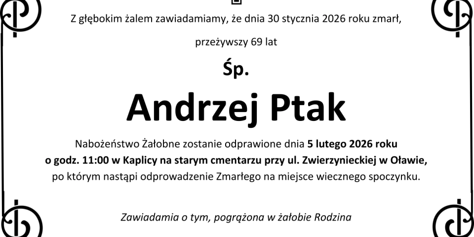 Z głębokim smutkiem zawiadamiamy, że 30 stycznia 2026 roku, zmarł przeżywszy 69 lat, Śp. Andrzej Ptak.