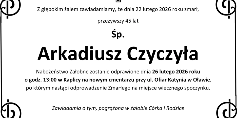 Z głębokim smutkiem zawiadamiamy, że 22 lutego 2026 roku, zmarł przeżywszy 45 lat, Śp. Arkadiusz Czyczyła.