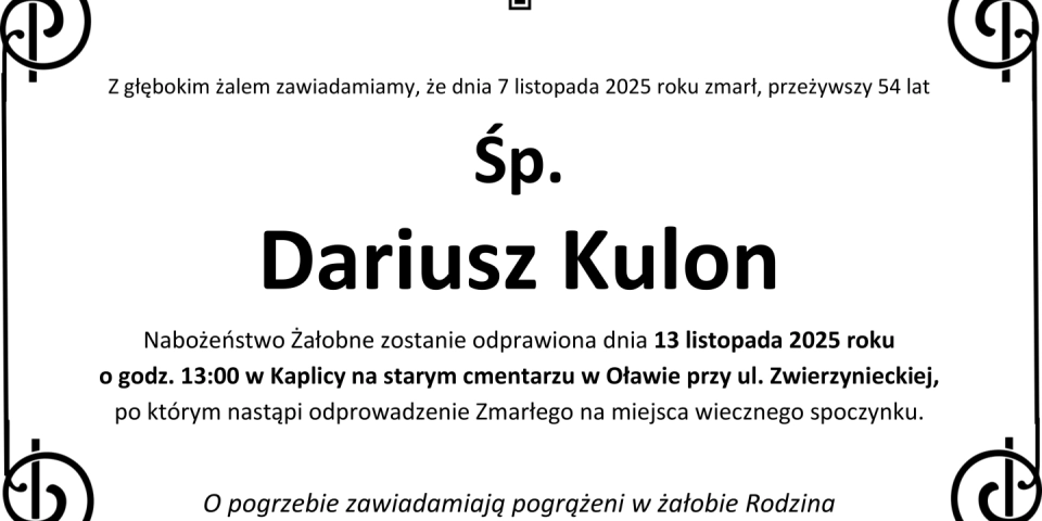 Z głębokim smutkiem zawiadamiamy, że 7 listopada 2025 roku, zmarł przeżywszy 54 lata, Śp. Dariusz Kulon.