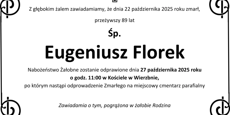 Z głębokim smutkiem zawiadamiamy, że 22 października 2025 roku, zmarł przeżywszy 89 lat, Śp. Eugeniusz Florek.