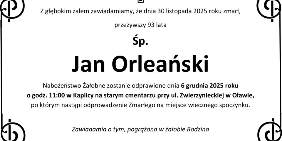 Z głębokim smutkiem zawiadamiamy, że 30 listopada 2025 roku, zmarł przeżywszy 93 lata, Śp. Jan Orleański.