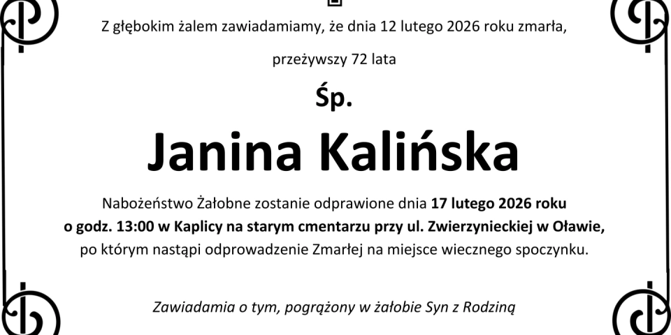 Z głębokim smutkiem zawiadamiamy, że 12 lutego 2026 roku, zmarła przeżywszy 72 lata, Śp. Janina Kalińska.