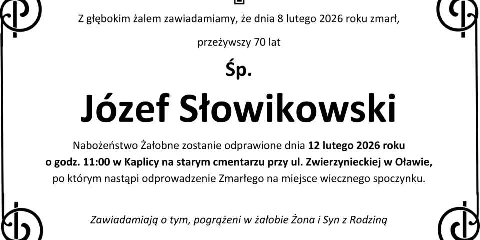 Z głębokim smutkiem zawiadamiamy, że 8 lutego 2026 roku, zmarł przeżywszy 70 lat, Śp. Józef Słowikowski.