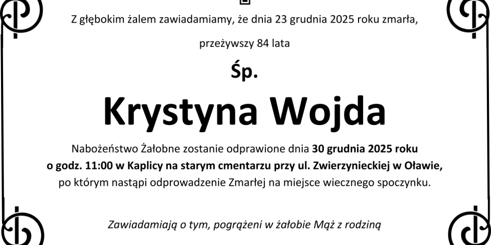 Z głębokim smutkiem zawiadamiamy, że 23 grudnia 2025 roku, zmarła przeżywszy 84 lata, Śp. Krystyna Wojda.