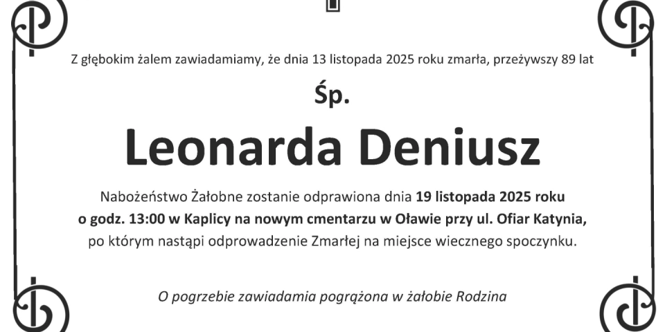 Z głębokim smutkiem zawiadamiamy, że 13 listopada 2025 roku, zmarła przeżywszy 89 lat, Śp. Leonarda Deniusz.