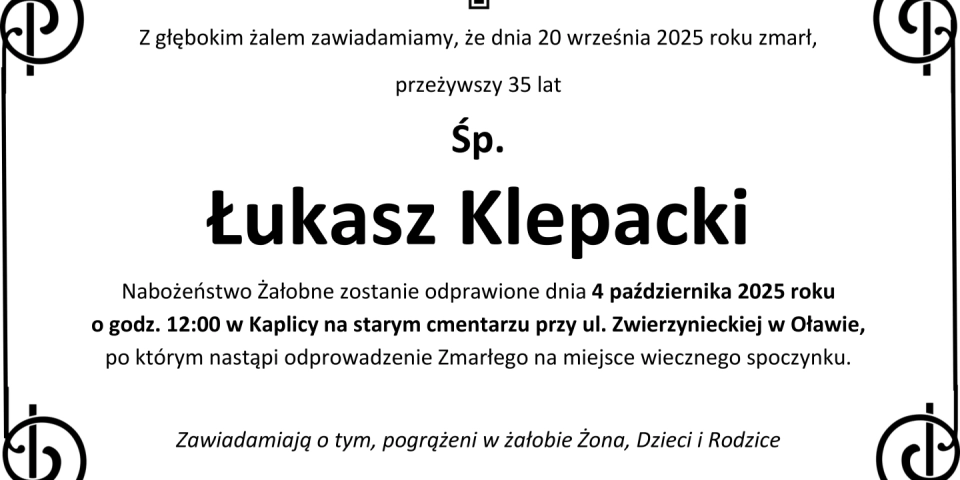 Z głębokim smutkiem zawiadamiamy, że 20 września 2025 roku, zmarł przeżywszy 35 lat, Śp. Łukasz Klepacki.