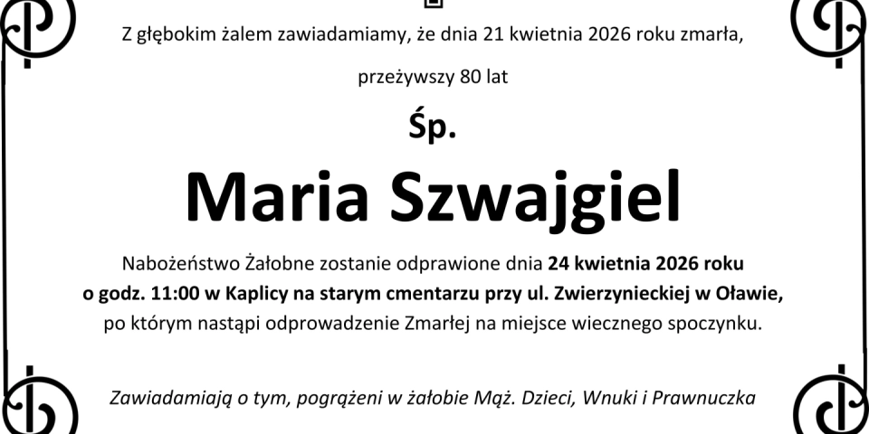 Z głębokim smutkiem zawiadamiamy, że 21 kwietnia 2026 roku, zmarła przeżywszy 80 lat, Śp. Maria Szwajgiel.