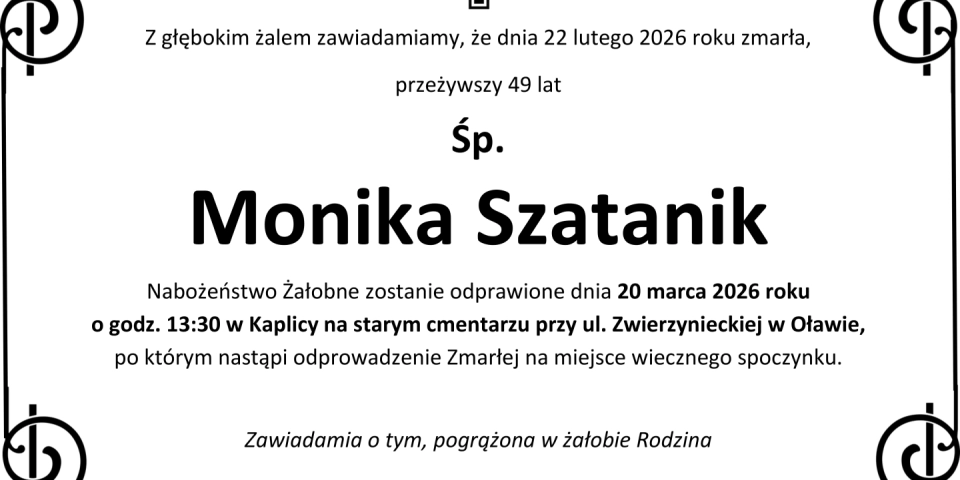 Z głębokim smutkiem zawiadamiamy, że 22 lutego 2026 roku, zmarła przeżywszy 49 lat, Śp. Monika Szatanik.