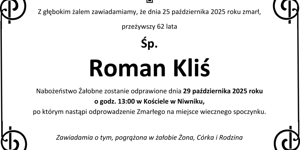 Z głębokim smutkiem zawiadamiamy, że 25 października 2025 roku, zmarł przeżywszy 62 lata, Śp. Roman Kliś.