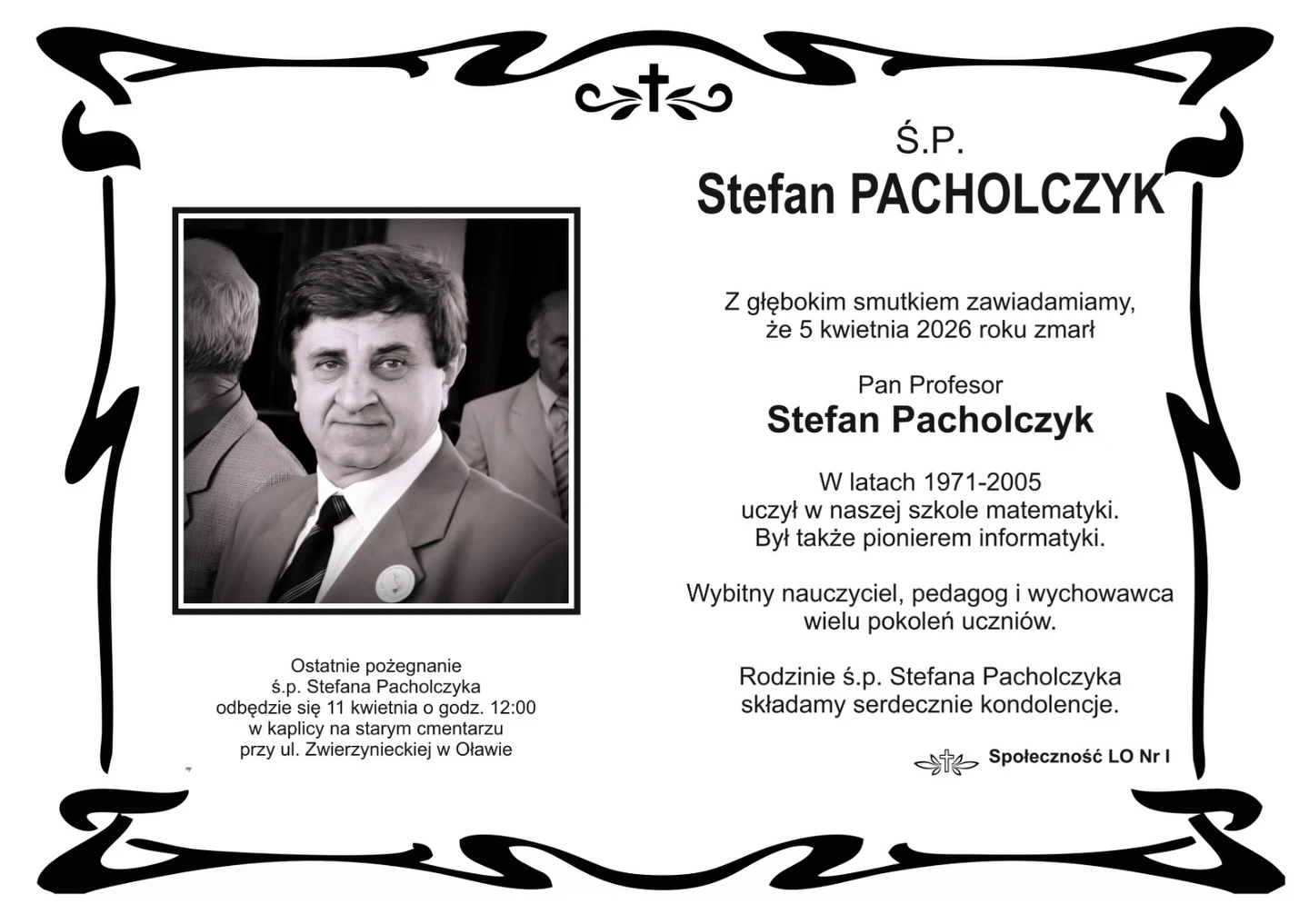 5 kwietnia zmarł Stefan Pacholczyk. Był związany z lokalną społecznością przez wiele lat, ucząc matematyki i będąc jednym z pionierów informatyki w Liceum Ogólnokształcącym im. Jana III Sobieskiego. Aktywnie wspierał rozwój nauczania w szkole, kształcąc kolejne pokolenia uczniów i zyskując uznanie jako wybitny pedagog.