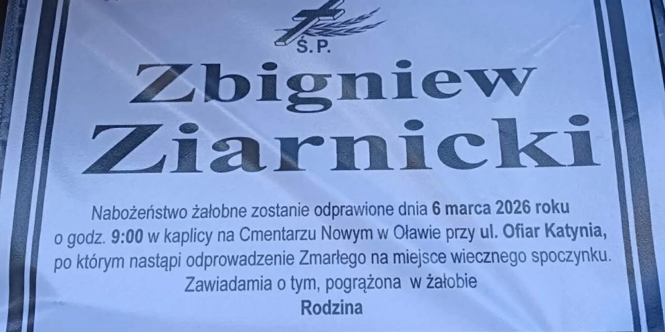 Nabożeństwo żałobne zostanie odprawione dnia 6 marca 2026 roku o godzinie 09:00 w kaplicy na nowym cmentarzu przy ulicy Ofiar Katynia w Oławie.