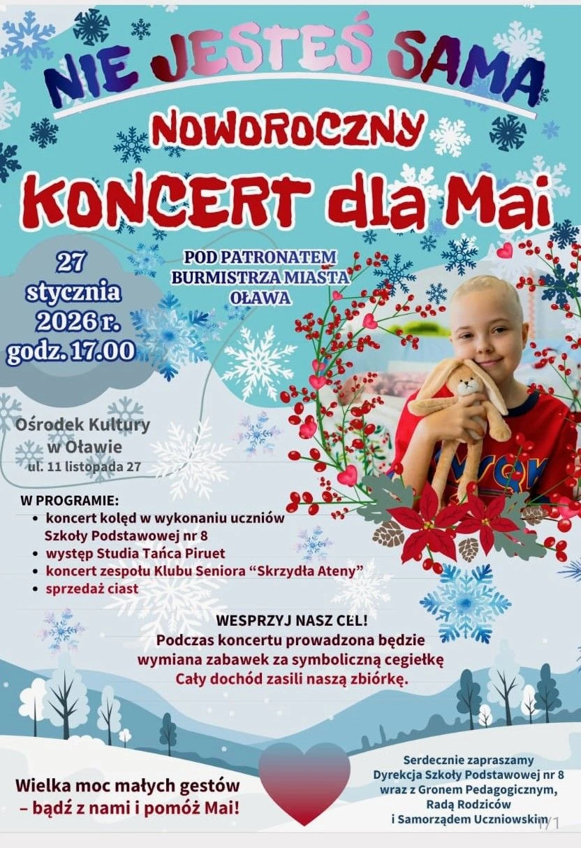 27 stycznia o godzinie 17:00 w Ośrodku Kultury w Oławie odbędzie się Noworoczny Koncert dla nastolatki. Na mieszkańców czekać będą: koncert kolęd w wykonaniu uczniów ze Szkoły Podstawowej nr 8 w Oławie,występ Studia Tańca Piruet, koncert zespołu Klubu Seniora "Skrzydła Ateny" oraz sprzedaż ciast.