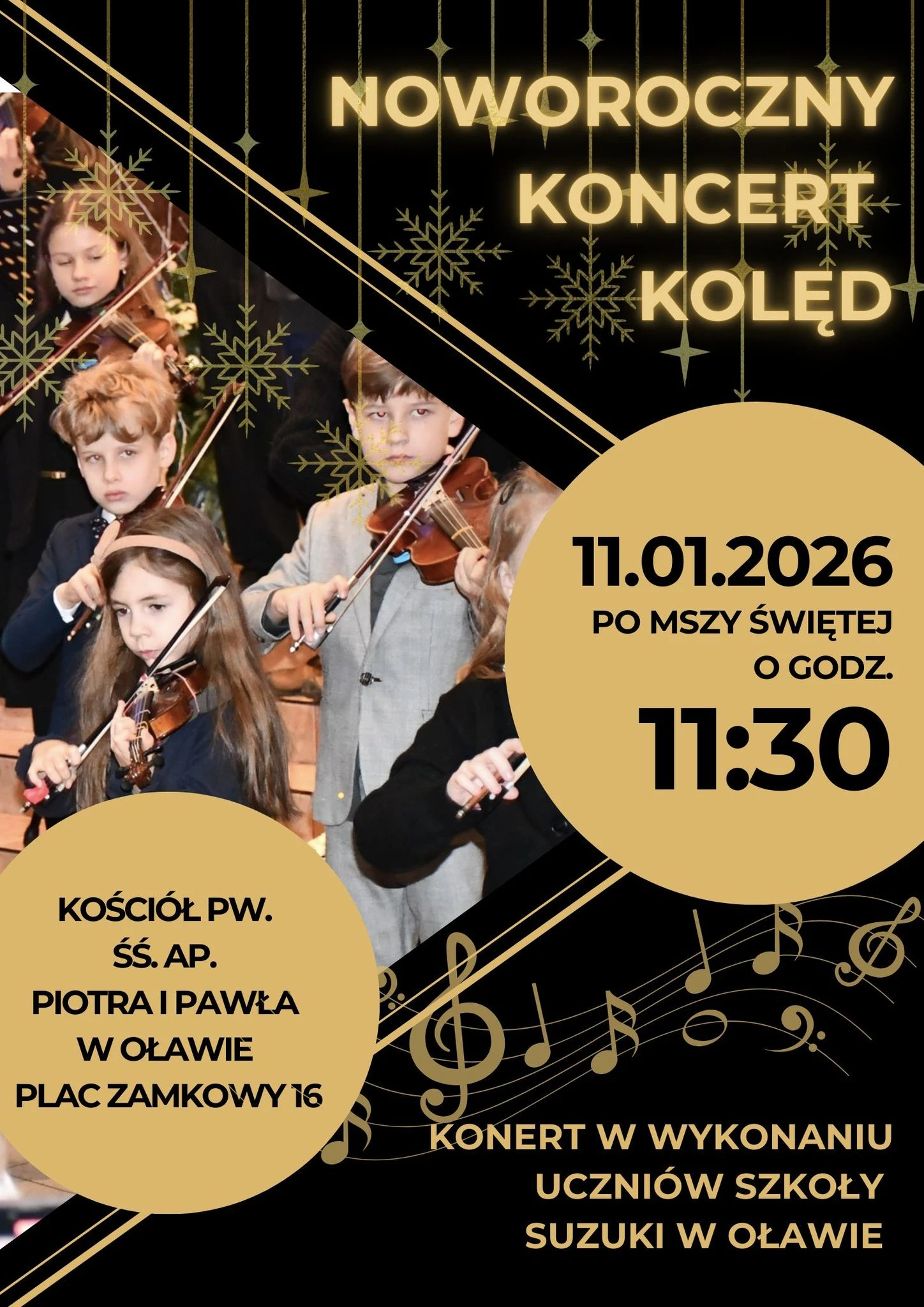 Tuż po Mszy Świętej odbędzie się Noworoczny Skrzypcowy Koncert Kolęd, podczas którego uczniowie Szkoły Suzuki w Oławie zaprezentują znane kolędy i pastorałki. Młodzi artyści wprowadzą słuchaczy w wyjątkowy klimat.