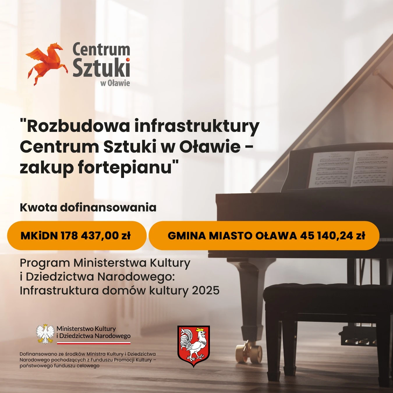 Centrum Sztuki w Oławie zrealizowało ważny projekt, który z pewnością wzbogaci życie kulturalne mieszkańców. Dzięki wsparciu finansowemu Ministerstwa Kultury i Dziedzictwa Narodowego oraz Gminy Miasto Oława, zakupiono nowy fortepian, który umożliwi organizację koncertów i wydarzeń artystycznych na jeszcze wyższym poziomie. Całkowity koszt inwestycji wyniósł 223 577,24 zł, z czego 178 437,00 zł pochodzi z programu "Infrastruktura Domów Kultury" finansowanego przez Ministerstwo Kultury i Dziedzictwa Narodowego. Gmina Miasto Oława wsparła przedsięwzięcie kwotą 45 140,24 zł.