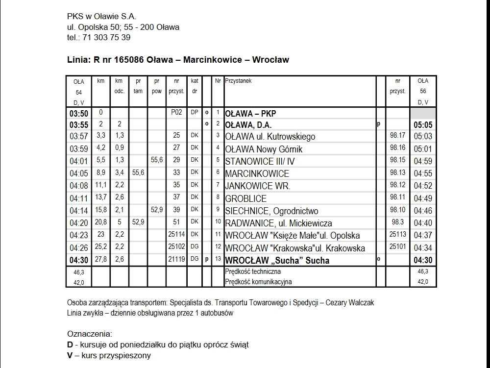 Nowy kurs zostanie uruchomiony od 15 grudnia. PKS Oława będzie obsługiwać połączenie z Oławskiego Dworca Kolejowego do Wrocławia (przystanek przy ul. Dawida) o godzinie 3:50.