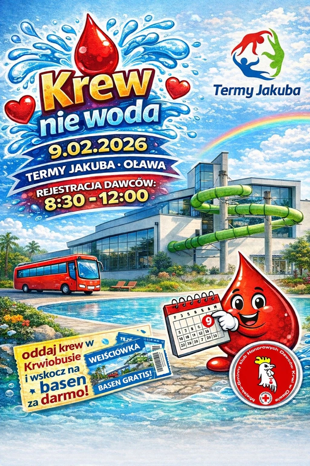 W bankach krwi wciąż brakuje krwi, szczególnie grupy A RhD-. Już w najbliższy poniedziałek, 9 lutego w godzinach 8:30 - 12:00, będzie okazja, by realnie pomóc. Przed Termami Jakuba w Oławie odbędzie się akcja krwiodawstwa "Krew nie woda". Każdy dawca otrzyma darmową wejściówkę na basen, a na uczestników czekać będzie ciepły napój.