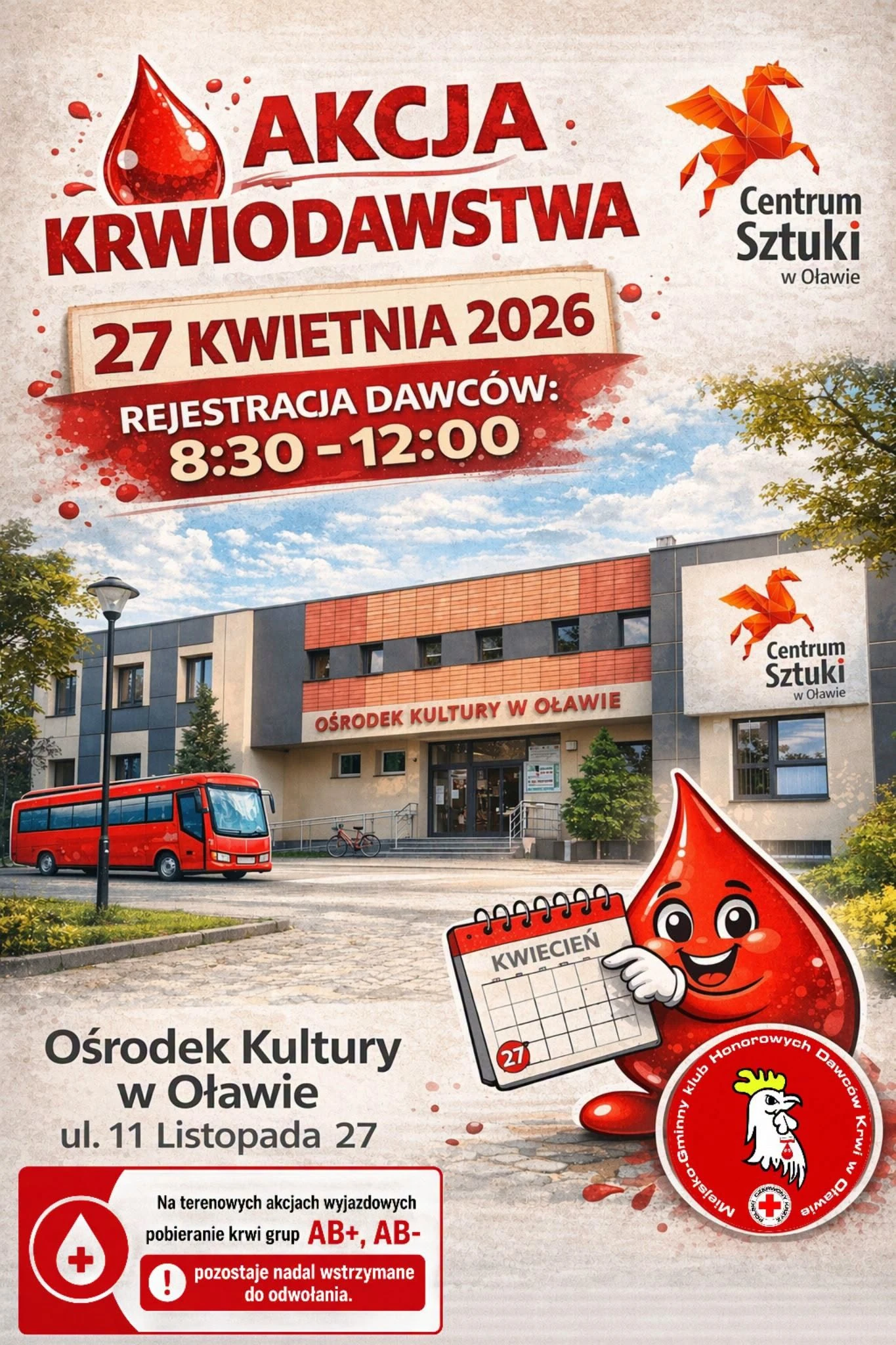 Krew będzie można oddać 27 kwietnia w Ośrodku Kultury w Oławie (ul.11 listopada 27) od godziny 8:30 do 12:00. Przypominamy, że podczas wyjazdowych akcji terenowych nadal obowiązuje wstrzymanie poboru krwi grup AB+ oraz AB-.