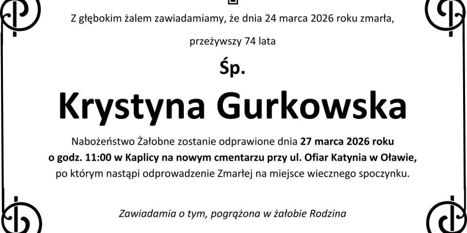 Z głębokim smutkiem zawiadamiamy, że 24 marca 2026 roku, zmarła przeżywszy 74 lata, Śp. Krystyna Gurkowska.
