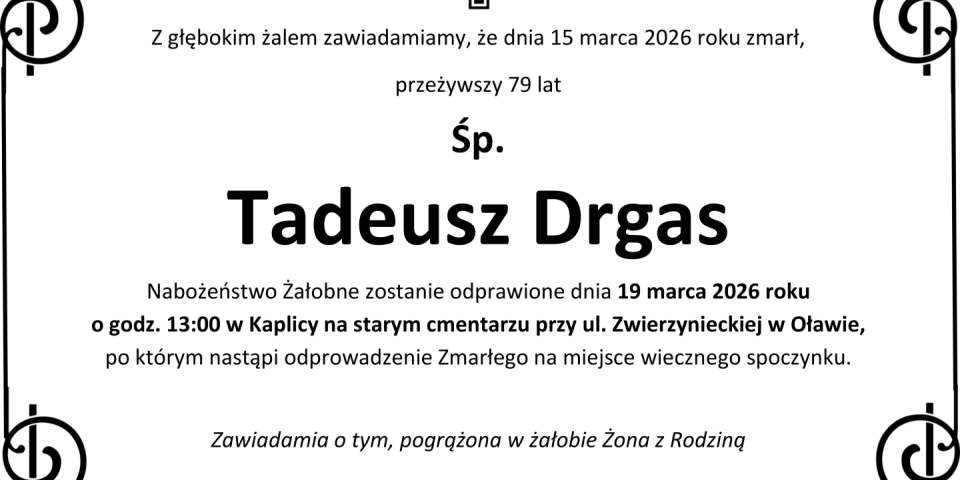 Z głębokim smutkiem zawiadamiamy, że 15 marca 2026 roku, zmarła przeżywszy 79 lat, Śp. Tadeusz Drgas.