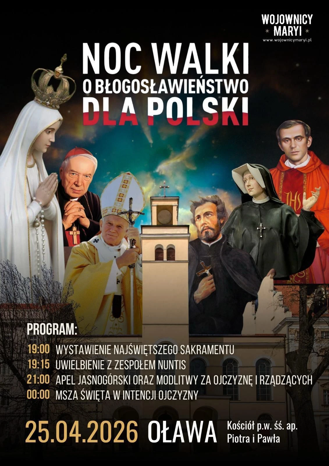 Noc Walki o Błogosławieństwo dla Polski odbędzie się w parafii św. Apostołów Piotra i Pawła w Oławie 25 kwietnia. Spotkanie rozpocznie się o godzinie 19:00 wystawieniem Najświętszego Sakramentu. Następnie uczestnicy wezmą udział w modlitwie uwielbienia, którą poprowadzi zespół Nuntis.