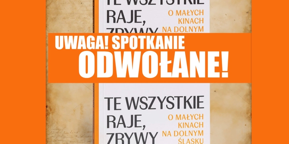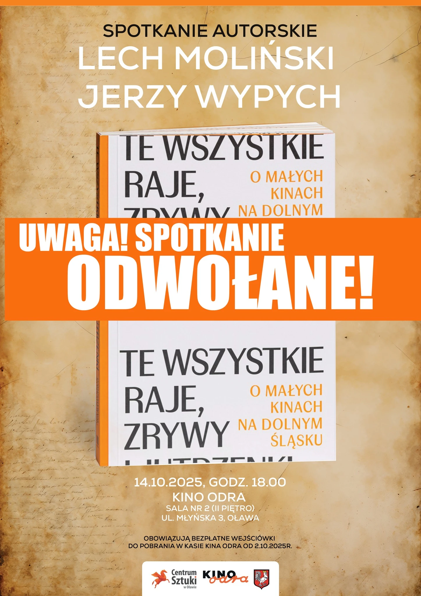 Pierwotnie spotkanie z autorami książki: „Te wszystkie Raje, Zrywy i Jutrzenki. O małych kinach na Dolnym Śląsku” – Lechem Molińskim i Jerzym Wypychem miało się odbyć 14 października o godzinie 18:00 w Kinie Odra. Termin został jednak zmieniony, o nowej dacie poinformujemy wkrótce.