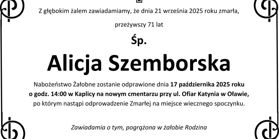 Z głębokim smutkiem zawiadamiamy, że 21 września 2025 roku, zmarła przeżywszy 71 lat, Śp. Alicja Szemborska.